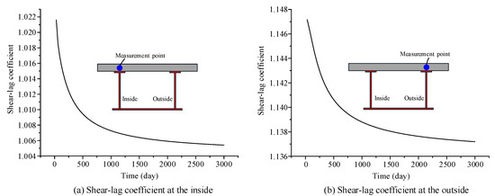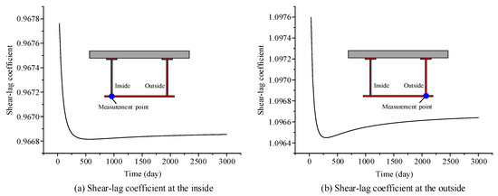 Change in the shear-lag warping strength function of the steel bottom flange, with respect to time: (a) shear-lag coefficient at the inside, (b) shear-lag coefficient at the outside.