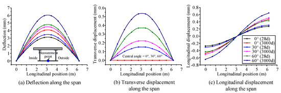 The initial central angles are set as 0°, 30°, and 60°, based on the curved composite box girder in Section 3, which is applied to verify the accuracy of the model. According to the proposed finite beam element model, the deflection, transverse displacement, and longitudinal displacement distributions along the span are calculated for a curved composite box girder at the initial and ultimate loading ages, as shown in Figure 9. The normal stress distributions along the transverse direction are calculated for the concrete slab and steel bottom flange at the initial and ultimate loading ages, as shown in Figure 10. Figure 9 shows that the maximum growth rates of deflection for central angles of 0°, 30°, and 60° are 30.5%, 29.2%, and 25.8%, respectively. The maximum growth rates of longitudinal displacement for central angles of 0°, 30°, and 60° are 20.3%, 20.6%, and 21.6%, respectively. The maximum growth rates of transverse displacement of the curved composite box girder with central angles of 30° and 60° are 47.2% and 45.1%, respectively. Figure 10 illustrates the stress distributions of the curved composite box girder with central angles of 0°, 30°, and 60° due to the influence of concrete shrinkage and creep. The tensile stress growth rates at the inside of the steel bottom flange for central angles of 0°, 30°, and 60° are 50.6%, 39.0%, and 18.6%, respectively. The compressive stress reduction rates at the inside of the concrete slab for central angles of 0°, 30°, and 60° are 58.8%, 57.8%, and 53.0%, respectively.