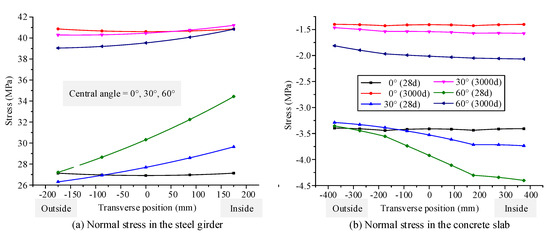 Normal stress distribution along the transverse direction of the curved composite box girder, with different central angles at the initial loading age and ultimate loading age: (a) normal stress in the steel girder, (b) normal stress in the concrete slab.