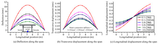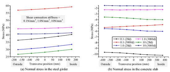 The curved composite box girder in Section 3 was selected as the research object. The interfacial shear connection stiffness values are set as 0.1, 1, and 10 N/mm3. According to the proposed finite beam element model, the deflection and transverse and longitudinal displacement distributions along the span of the curved composite box girder at the initial and ultimate loading ages are calculated, as shown in Figure 11. The normal stress distributions along the transverse direction are calculated for the concrete slab and steel bottom flange at the initial loading age and ultimate loading age, as shown in Figure 12. Figure 11 shows that the maximum deflection growth rates are 54.4%, 32.3%, and 28.9% for curved composite box girders with shear connection stiffness values of 0.1, 1, and 10 N/mm3, respectively, due to the influence of concrete shrinkage and creep. Moreover, for shear connection stiffness values of 0.1, 1, and 10 N/mm3, the maximum growth rates of transverse displacement are 116.1%, 67.2%, and 49.2%, respectively, whereas the maximum growth rates of longitudinal displacement are 86.9%, 75.8%, and 71.3%, respectively. Figure 12 shows that the tensile stress growth rates at the inside of the steel bottom flange are 47.1%, 35.2%, and 37.8% for curved composite box girders with shear connection stiffness values of 0.1, 1, and 10 N/mm3, respectively, due to the influence of concrete shrinkage and creep. Under these same stiffness values, the compressive stress reduction rates at the inside of the concrete slab are 44.6%, 59.4%, and 57.1%, respectively.