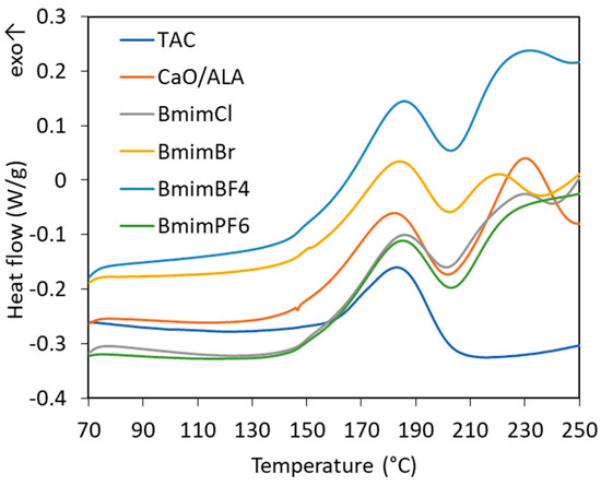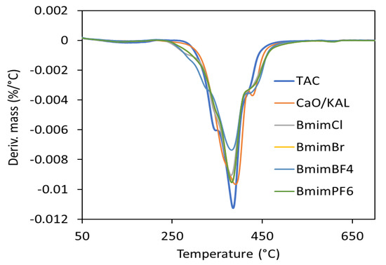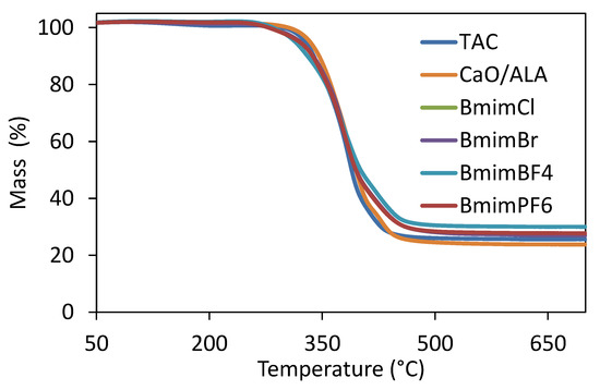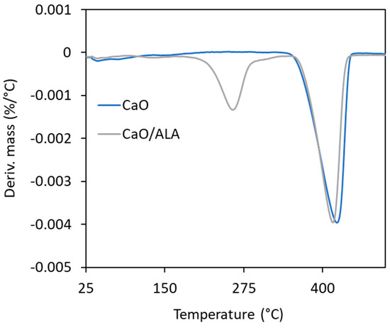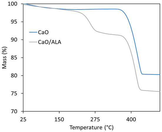 Raw and ALA-grafted CaO was characterized using thermogravimetry (TG) with a TGA/DSC1 (Mettler Toledo, Greifensee, Switzerland) analyzer. Analyses were conducted in an inert gas atmosphere (argon, 50 mL/min) by heating the samples from 25 to 600 °C, with a heating rate of 10 °C/min. The mass losses obtained for raw and ALA-grafted CaO, were applied to calculate the content of ALA on the CaO surface, and consequently the efficiency of CaO modification. Analysis of evolved gas was performed using Setsys TG-DTA 16/18 analyzer (SETARAM Instrumentation, Caluire-et-Cuire, France) coupled to a Balzers (Pfeiffer, Aßlar, Germany) mass spectrometer.
