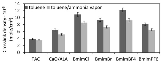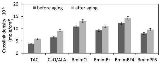 38]. The accelerating effect of ILs resulted in the reduction in the scorch time and the curing time of rubber compounds. Additionally, vulcanizates with ILs exhibited higher crosslink density compared to those without ionic liquid.