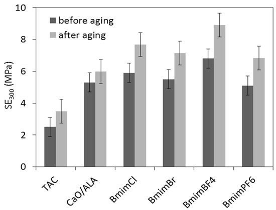 32]. Filler modification with ILs was reported to strengthen the interactions between a filler and an elastomer matrix and consequently promote the uniform distribution of filler particles in the elastomer. As a result, the mechanical performance of various elastomer composites was effectively improved [