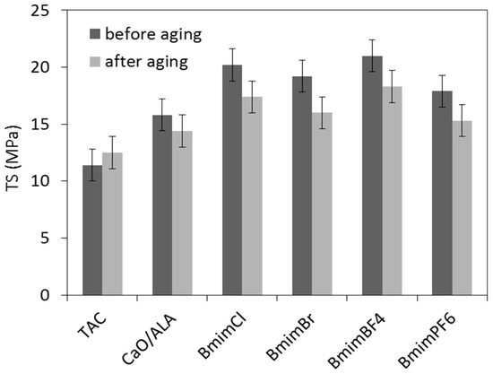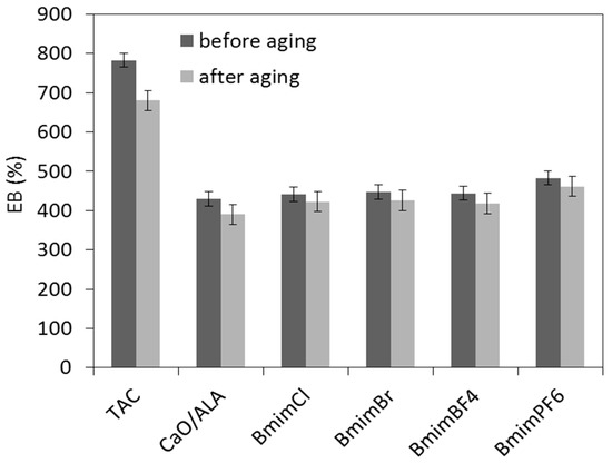 Application of the CaO/ALA slightly increased the optimal vulcanization time compared to the conventional TAC coagent. Most importantly, the reaction of the CaO/ALA coagent functional groups with the rubber chains considerably increased the crosslink density of the vulcanizates due to the formation of ionic crosslinks. ILs did not affect the optimal vulcanization time but significantly improved the crosslink density of the vulcanizates. This may result from the better dispersion of the CaO/ALA particles in the elastomer, which increased the contact between the functional groups of the coagent and the EPM rubber chains, consequently improving the activity of the coagent in the crosslinking reactions. The highest crosslink density demonstrated the vulcanizates containing BmimBF4, for which the most uniform dispersion of the coagent and filler particles in the EPM matrix was observed. CaO/ALA increased the tensile strength and considerably reduced the elongation at break in comparison with the vulcanizate containing TAC. ILs resulted in further improvement in the TS of the EPM vulcanizates without a significant influence on their elongation at break. The highest TS showed the vulcanizates with BmimBF4. We concluded, that two main factors contributed to improving the tensile strength of the vulcanizates. The first is the increase in crosslink density due to the action of the CaO/ALA coagent, while the second is the formation of ionic crosslinks in the elastomer network and their labile nature.