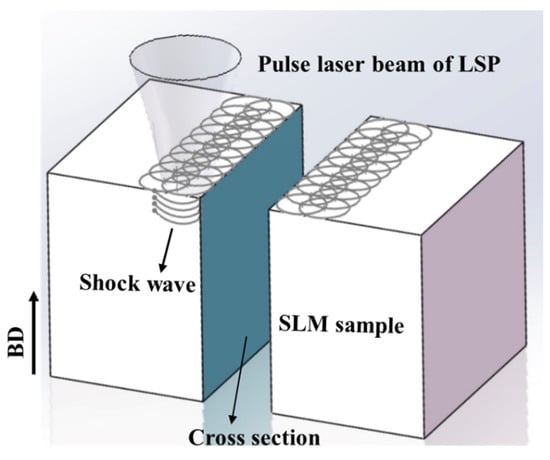 SLM manufacturing was conducted on an EOS M280 machine with gas-atomized Ti64 powder. Table 1 shows the composition of Ti64 powder used in the present study. The SLM machine employs a strategy of short line scanning with a rotation angle of 67° between layers with thicknesses of 30 μm. A laser beam with a spot size of ~100 μm and a hatch spacing of 140 μm was used. The laser power was 280 W, and the scanning speed was 1200 mm/s. All the specimens were fabricated on the pure titanium substrate with dimensions of 250 × 250 × 15 mm3. During SLM, an argon atmosphere was used, and the O2 concentration was in a range of 0.05–0.1 vol.%. After the samples were produced via SLM, LSP treatment was applied on the surface of the formed samples. Samples with a size of 10 × 10 × 6 mm3 were cut and conducted by one side LSP for microstructure observation. During LSP, an Nd:YAG laser with a wavelength of 1064 nm, and a laser power intensity of 11.89 GW·cm−2 was used. The pulse duration was 12 ns, and the diameter of the laser beam was set to 2.5 mm. The overlapping rate between the two laser paths was 25% with a zigzag manner. Figure 1 presents a schematic of the LSP principle for an SLM-manufactured Ti64 sample.
