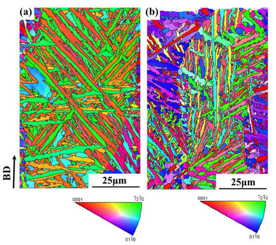 Figure 3 shows the EBSD maps of the cross-section of SLM-manufactured Ti64 samples before and after LSP, respectively. It is clear that the SLM-built Ti64 sample exhibits many long and straight laths, and they are identified as hexagonal close-packed (hcp) phase, and no body centered cubic (bcc) β phase exists, as shown in Figure 3a, which deviates from equilibrium microstructure at room temperature: α + β phases. Such a phenomenon was analyzed as follows. During SLM, very rapid cooling in the orders of thousands of degrees per second for each layer building results in the diffusionless martensitic transformation of bcc β → hcp α’ in the SLM-manufactured Ti64 sample [19]. Therefore, the hcp phase measured by XRD is metastable α´ phase, rather than stable hcp α phase. Their orientations mainly focus on or near [0001] and [20] of the hcp phase, and a few orientations are on or near [010], but long and straight laths markedly decrease in the sample treated by LSP (Figure 3b), indicating that the hcp phase is refined. Meanwhile, their orientations also change, that is, [010] significantly increases accompanied by the decrease of [0001] after LSP. According to Zhu et al. [20], the grain refinement and orientation change of α´ phase are attributed to the plastic deformation during LSP.
