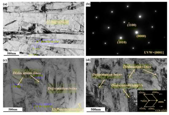 TEM images of SLM Ti64 specimens (a,b) before and (c,d) after LSP. (a) Coarse α’ martensite, (b) selective area diffraction pattern (SADP) of hcp α’ phase, (c) refined α’ martensite and (d) dislocations, deformation twins and the corresponding SADP.
