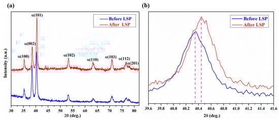 XRD measurement was performed on the surface layer of as-built Ti64 samples before and after LSP. From Figure 5, XRD patterns show a single hcp phase, which is consistent with EBSD, and thus the hcp phase is α’ martensite. From Figure 5a, LSP does not produce a new phase, but the diffraction peaks shift into a higher angle (Figure 5b). The full width at half maximum of the diffraction peak increases, which may be a result of grain refinement on the surface layer of the SLM-built Ti64 sample via LSP.