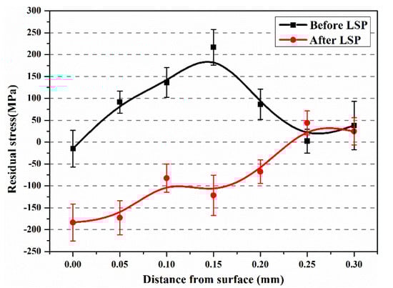- The LSP treatment produces CRS of maximum magnitude up to −180 MPa, and the depth of the CRS layer reaches 250 μm.