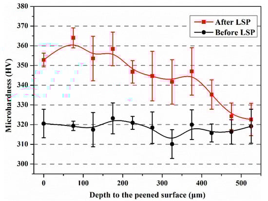 As shown in Figure 7, in-depth micro-hardness distribution of the SLM-fabricated Ti64 sample before and after laser peening was characterized. The micro-hardness of the SLM-fabricated Ti64 sample increased from 318 HV to 353 HV after being subjected to LSP, namely, an increase of 10%. The increase of micro-hardness is attributed to the increase of dislocation density and grain refinement by LSP. The influence of grain refinement on micro-hardness was evaluated according to the well-established Hall–Petch equation [31], which reflects the relationship between the micro-hardness (Hv) and the average grain size (d) of the materials: