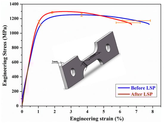 Engineering stress–strain curves of SLM-fabricated Ti64 samples before and after LSP; error bars represent one standard deviation.