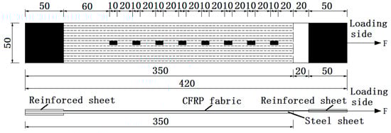 A set of eight strain gauges are attached to the CFRP fabric in each specimen. The distance between the center point of each strain gauge is 30 mm. Each strain gauge is covered with a part of silica gel to prevent contact damage. The fiber fabric is pasted along the length of the steel sheet. For better loading, a piece of steel-reinforcing sheet is pasted at both ends of the steel sheet, as shown in Figure 1.