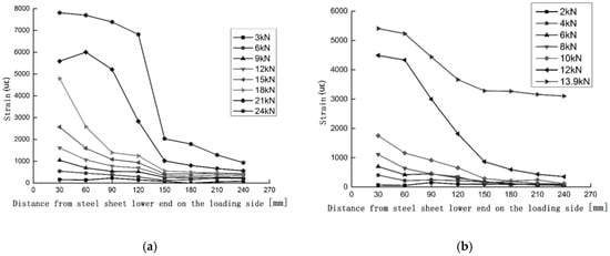 Strain-location curves of specimens (a) B-2-1 and (b) C-2-1.
