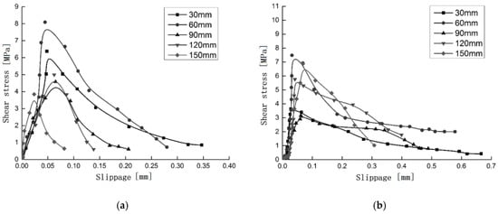 The average shear stress at the interface between CFRP fabric and steel can be calculated by the difference method from the strain values measured at different measuring points on the CFRP fabric, as shown in Equation (1). The local slip at the interface between CFRP fabric and steel sheet is caused by the strain difference between the two materials. It can be calculated according to the strain value of each measuring point on the CFRP fabric. The slip starts on the side of the free end and gradually accumulates to the loading end []. When the bonding length of the CFRP fabric is long, the strain value of the steel sheet and the slip of the free end can be regarded as approximately zero. The calculation formula is shown as Equation (2).