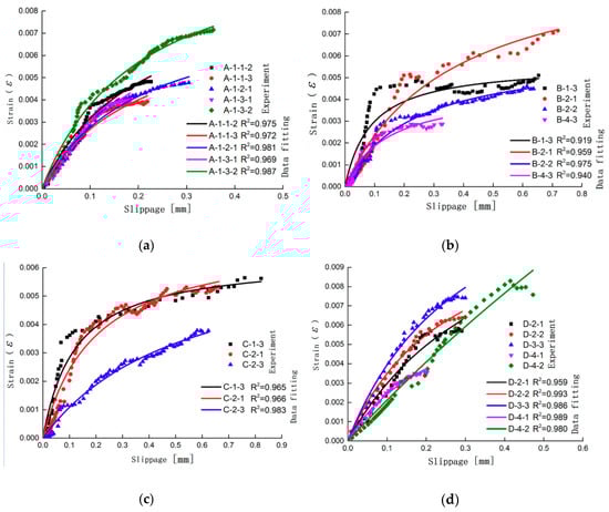 Based on the strain value obtained in the test and the calculated slip value, the functional relationship between these two parameters is fitted. The strain slip test value and the fitting curve of some specimens are shown in Figure 5. This functional relationship needs to meet the following two requirements: (1) Accuracy requirement: the correlation coefficient is greater than 0.9; (2) Boundary condition requirement: the function should include the value of the (0,0) point. The final established functional relationship is shown in Equation (6).