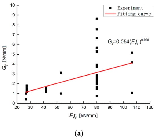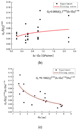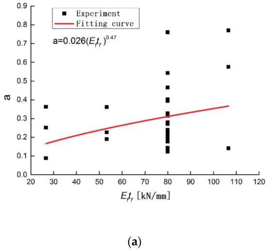 This indicates that the functional relationship of still contains the two parameters and . To establish an interface constitutive model under the combined action of multiple factors, the relationship between these two parameters and other factors must be established first. These factors include the stiffness of the CFRP fabric, the thickness of the glue layer, and the surface roughness of the steel sheet. As shown in Figure 6 and Figure 7, the functional relationship between other factors and the two parameters and is obtained through data fitting, as shown as Equations (11) and (12):