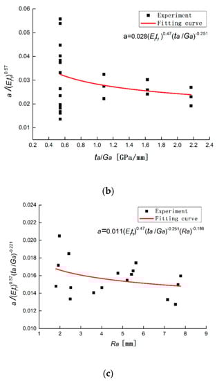 Effect of different factors on the parameter a: (a) Testing group of the specimen with different CFRP fabric stiffnesses; (b) Testing group of the specimen with different glue thicknesses. (c) Testing group of the specimen with different surface roughnesses.