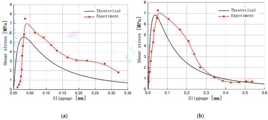 To verify the agreement between the theoretically derived interface constitutive model and the test, the test results are compared with the theoretical constitutive model, as shown in Figure 8. It can be seen from the figure that although there are certain differences between the predicted interface bond-slip relationship and the test curve, the overall trend of the two is in good agreement, which can be used as a reference for predicting the constitutive relationship of the interface.