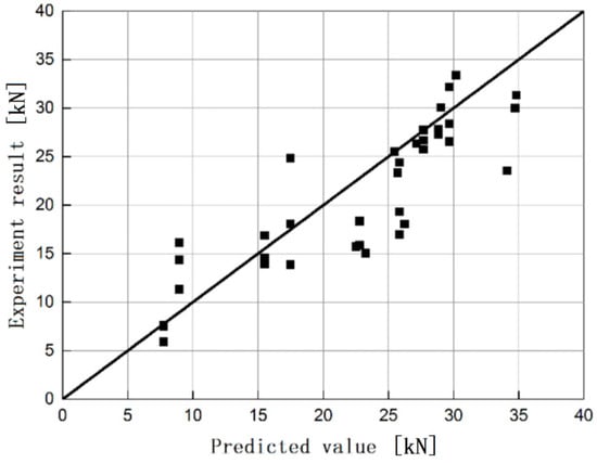 It can be seen from Figure 9 that the data points are more evenly distributed on both sides of the straight line, indicating that the theoretically predicted value of the ultimate bearing capacity agrees well with the experimental value. The interface bonding strength model of CFRP fabric and steel obtained by derivation can be used to calculate the predicted ultimate bearing capacity of each test piece. When compared with the experimental values, which are listed in Table 4, the average of the ratio of the two values is 0.93, and the coefficient of variation is 0.208.