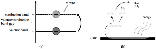 (a) Electron jump from the valence band to the conduction band via the addition of energy and (b) depletion of the matrix by energy, resulting in the production of water and carbon dioxide. CFRP: Carbon-fiber-reinforced plastic.