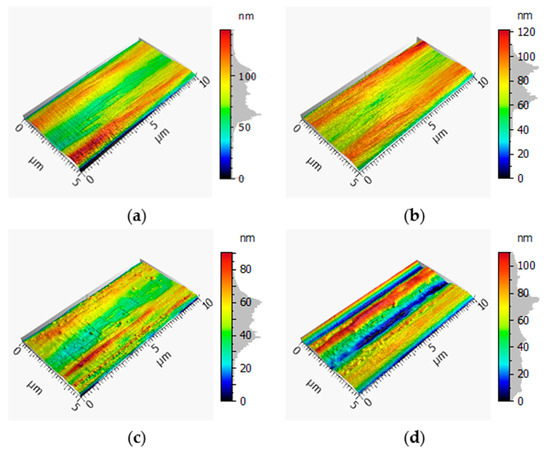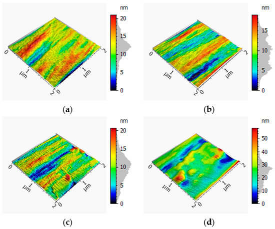 Figure 3 provides more detailed records of the filaments, where Figure 3a,b depict both references and show similar surfaces. The filament detached from a sample treated with a power output of 66% (Figure 3c) displayed a rougher surface with more elevations and recesses, but was quite comparable to the reference fiber without the sizing agent, as seen in the arithmetic heights of 10.80 ± 0.28 nm and 10.84 ± 3.76 nm, respectively (Table 1). Figure 3d shows a filament detached from a sample treated with a power output of 96% and presented the smoothest surface of all four records. The elevations and recesses were detected but the transition was smooth.