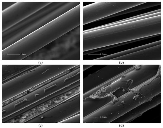 Scanning electron microscopy (SEM) images of the filaments: (a) reference, (b) reference without the sizing agent, (c) detached and treated with 66% power, and (d) detached and treated with 96% power.