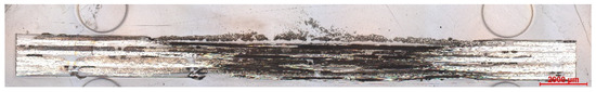 In Figure 6, it can be observed that the process reached all layers of the sample. It was treated on both sides using the process described in Section 2.2. The treated area is the region in black. In the middle of the sample, the treated width got smaller. The chain reaction of the depletion of the matrix on the surface continued inside the sample. However, the treated area got smaller the deeper it penetrated. Furthermore, some of the rovings unbound from the composite were visible on top of the sample. With the set process parameters, the four-layered CFRP sample could be completely penetrated and subsequently freed from the matrix.