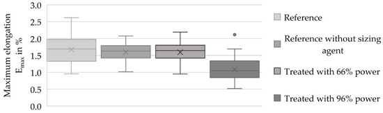 Figure 7 exhibits the results of the tensile test regarding the maximum elongation. The reference had an average maximum elongation of 1.68 ± 0.41%. The detached fiber (treated with 66% power) exhibited an average maximum elongation of 1.59 ± 0.29%, which was 94.64% of the reference’s maximum elongation. The filaments treated with 96% power had a value of 1.09 ± 0.34%, which was 64.88% of the reference’s maximum elongation. The reference freed from the sizing agent had a maximum elongation of 1.60 ± 0.26%; this value corresponded to 95.24% of the reference’s maximum elongation.