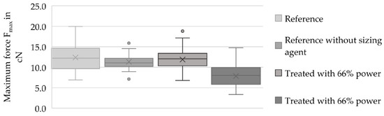 Regarding the maximum forces shown in Figure 8, the average maximum force of the reference was 12.36 ± 3.30 cN. The detached fiber (treated with 66% power) had an average maximum force of 11.87 ± 2.74 cN, which was 96.04% of the reference’s average maximum force. The sample that was treated with a power output of 96% had an average maximum force of 7.85 ± 2.52 cN, which was 36.49% less than the reference. Additionally, it was 33.87% less than the sample treated with a power output of 66%. The reference that was freed from the sizing agent showed a value of 11.32 ± 1.90 cN.