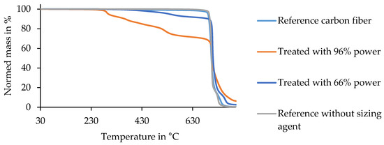 TGA is an analytical method in which the change of bulk of a sample is measured as a function of temperature and time. For this paper, the TGA Q500 from TA Instruments (New Castle, DE, USA) was used. Within this test, there was a temperature field of 30 °C to 800 °C under atmospheric conditions. Some detached fibers of the samples treated with power outputs of 66% and 96% were measured in comparison to a reference fiber that had not been embedded and filaments that were freed from the sizing agent.