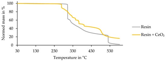 Figure 9 depicts the TGA results of the filaments. Here, a thermally induced depletion of the fibers and matrix occurred. This analytical measurement method was used to depict how the depletion process affected the fibers and how the thermally induced photocatalytic process appeared. Within Figure 10, the curves of the TGA of pure resin and resin combined with CeO2 are shown.