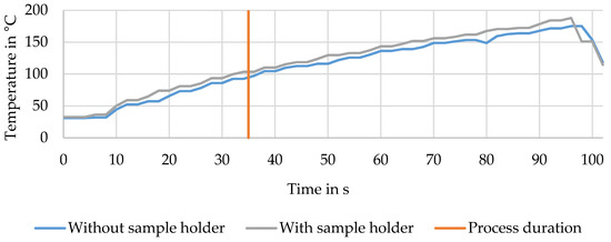 Between the two curves is a small temperature difference, where the sample was 9.39 K warmer on average with the sample holder underneath. Furthermore, it was shown that over 100 s, a maximum temperature of about 180 °C was reached. The orange vertical line marks the average process duration; the temperature reached lay at about 100 °C.