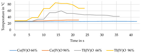 Figure 12 shows the temperature development during the UV heating process. The dashed line depicts the course of the process implemented with a power of 66% and the black line shows the process with 96% power. Both temperature graphs lay underneath a temperature of 40 °C. For comparison, trials with TiO2 are depicted as well. The temperature developments for processes implemented with 96% and 66% powers are shown. Both curves lay above the curves for CeO2. The maximum temperature reached by TiO2 was about 80 °C. However, the difference between both oxides shows the effectiveness of CeO2, which led to the final choice of the semiconductor.