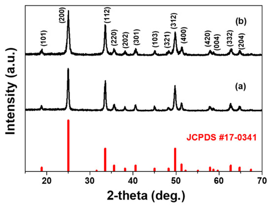 The degree of crystallinity and the crystal structure of hydrothermally grown nanophosphors were analyzed. Compared to the reference data (JCPDS 17-0341), as shown in Figure 1, each compound has the typical diffraction peaks of the tetragonal with I1/amd1 space group YVO4 compound. Both the samples have identical crystalline structure, and, thus, the precursor solution acidity (amount of ammonium solution) has a little influence on the phase formation of the corresponding phosphor host materials. The additional XRD results for nanoparticles as-synthesized at different pH values clearly show the YVO4 structure (JCPDS 17-0341) (Figure S1). The crystal size was estimated using the Scherrer equation, and the average values for the as-synthesized particles were around 30–50 nm.