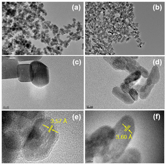 Corresponding TEM images of the YVO4:Eu3+ nanoparticles grown using the precursor solutions with (a,c,e) for pH = 7 and (b,d,f) for pH = 10.
