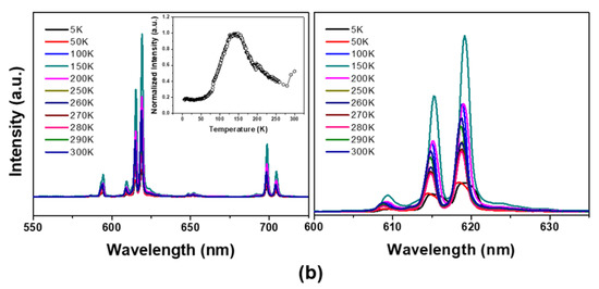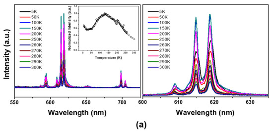 The temperature-dependent emission spectra of the corresponding nanophosphors are presented in Figure 4. First, upon the He–Cd laser excitation at room temperature (T = 300 K), the Eu3+-doped YVO4 nanoparticles give a strong red-emission from the 5D0–7FJ transition of Eu3+ [10,11,12]. The Eu3+-doped YVO4 nanoparticles also exhibit a broad excitation band positioned at 312 nm, which is not shown, corresponding to charge transfer from oxygen to the central vanadium atom inside anions within overall temperature ranges. The site symmetry and electric dipole transitions between the f-electron levels of Eu3+ in the nanocrystalline YVO4 host are similar to those of micron scale phosphor, which induce the excitation and efficient energy transfer to the Eu3+ ions from charge-transfer states involving the V–O component of the lattice.