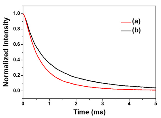 Generally, the formulation of impurities/defects within the phosphor, serves as carrier trap centers, of which the trapped carriers have the ability to escape from followed by the appearance of delayed-radiation process [26]. As shown in Figure 5, we can realize a longer decay time for nanophosphors with higher trap-density prepared at pH = 10 solution; 2.89 ms for YVO4:Eu3+ phosphor grown at pH = 10 and 1.76 ms for pH = 7, respectively. Thus, a lower luminescence intensity below 150 K for the sample with higher trap density is well consistent.