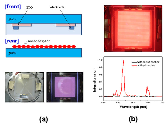 Finally, we fabricated transparent panels for plasma discharge and analyzed the luminance property of the as-prepared nanophosphors. The test panels consisted of front and rear glass plates. A schematic diagram of the test panel using rear plates without a phosphor layer is shown in Figure 6a. Upon plasma discharging, the luminance of the panels coated with YVO4:Eu3+ nanophosphor increased up ~50 cd/m2, while the luminance was below 5 cd/m2 for the panel without phosphor layer (Figure 6b) Based on the YVO4:Eu3+ nanophosphor-illuminating panel with the characteristic red emission, the given nanophosphors are comparable to the micron scale red emitting phosphors even under VUV radiations.