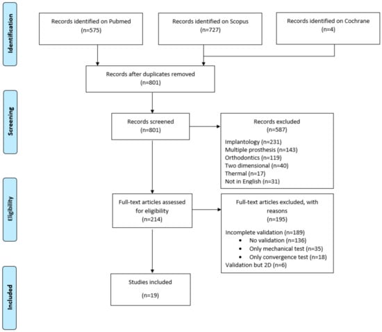 Using the present search strategy, 1306 records were identified from the MEDLINE [PubMed], SciVerse Scopus, and The Cochrane Library databases (Figure 1). After removal of duplicates, 801 records remained for title and abstract screening. At this stage, records dealing with implantology (n = 231), multiple prosthesis (n = 143), orthodontics (n = 119), two-dimensional analysis (n = 40), thermal analysis (n = 17), or in a language other than English (n = 31) were excluded. Six records were subsequently excluded due to absence of the response to full text request, and 214 records were selected and read in full. Among these, 189 articles presented incomplete validation (no validation process was described in 136 articles, verification was done by the use of a convergence test only [n = 18] or mechanical tests without quantified comparison to numerical data [n = 35]). The remaining 25 (11.6%) articles presented a validated FE model by comparison to experimental data, and among these, those with two-dimensional validation of the FE models (n = 6) were excluded. Nineteen studies were finally included (Figure 1) and the main characteristics of the FE models were noted (Table 2) [19,20,21,22,23,24,25,26,27,28,29,30,31,32,33,34,35,36,37].