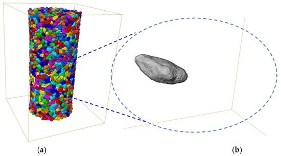 Image obtained from micro-tomography (μCT) reconstruction: (a) three-dimensional (3D) labeled image; (b) an individual particle.