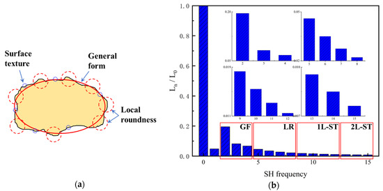 where is the second-order norm, and * is the conjugate transpose. Note that Ln is an SH invariant with respect to particle translation and rotation. Since L0 is related to particle size, all the second-order norms are divided by L0 to eliminate the particle size effect. L1 is only related to particle shift and, hence, ignored in the classification. In addition, SHA was already proven to accurately describe the morphology information of LR and ST when the maximum SH frequency is 15 or greater [22,37,38,39] and, hence, SH frequency n = 15 is chosen in this paper for further analysis. Figure 2 depicts the multi-scale features of particle morphology and the averaged second-order norms for all the 4155 particles in each frequency. Based on different Ln/L0 values in each frequency, particle surface can be decomposed into a series of sub-surfaces containing morphological genes at three different RLS, i.e., general form (GF) at n = 2 to 4, local roundness (LR) at n = 5 to 8, and surface texture (ST) n = 9 to 15 [23,39,40,41]. In order to discuss the inter-scale effect at finer RLS, ST is further divided into first-level surface texture (1L-ST) n = 9 to 12 and second-level surface texture (2L-ST) n = 13 to 15. Therefore, with calculated and Equation (1), any given particle surface can be decomposed into a series of sub-surfaces at different RLS. For instance, the corresponding LR-level sub-surface can be reconstructed by SH frequency with the first 81 coefficients of .