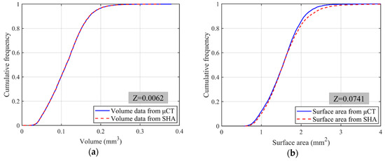 where μ1 and μ2 are the means of two distributions, while σ1 and σ2 are the standard deviations. For all 4155 LBS particles, the mean and standard deviation of particle volume from μCT data are 0.1136 and 0.0454, while those from SHA are 0.1132 and 0.0453, respectively. Similarly, the mean and standard deviation of particle surface area are 1.5419 and 0.4375 for μCT data, and 1.5923 and 0.5203 for SHA. Figure 3 compares their cumulative frequency distributions from μCT and SHA. Solid lines show the volume and surface area distributions from μCT scans, while dotted lines are from SHA. The Z value is 0.0062 for particle volume and 0.0741 for particle surface area, and they are all within 1.96, which reflects a sufficiently close match between these two distributions with a confidence level of 95% [43].