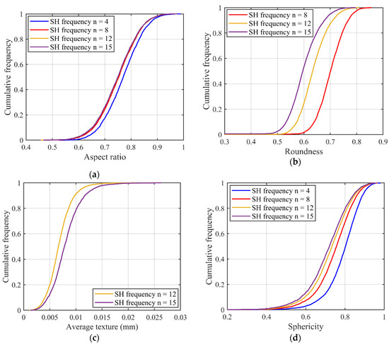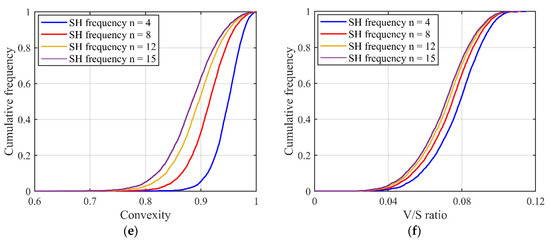 However, a big difference in the degree of variation exists in different descriptors, with the largest and smallest variations seen in roundness and V/S ratio, respectively. To be more exact, the aspect ratio (Figure 4a) can be affected by LR-level morphology information, and it shows little sensitivity to high-level morphologies like ST. The LR, from Figure 4b, is highly sensitive to the morphology variation of 1L-ST and 2L-ST and shows a decreasing trend with an increasing SH frequency. The average texture for the ST-level morphology information, as shown in Figure 4c, is sensitive to the smaller RLS such as 2L-ST and witnesses a positive correlation with the SH frequency. The remaining three overall shape parameters (Figure 4d,e,f) reflect the general variation of particle shape. Thus, morphology information from all the different RLS can affect the estimation of these descriptors. Therefore, the inter-scale effect exists in particle morphology representation on all length scales from GF to high-level ST.