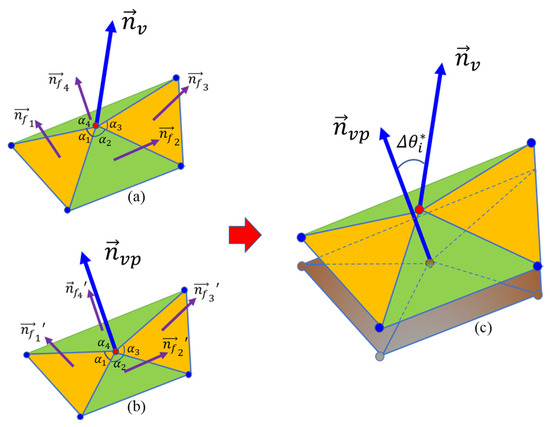 where is the normal vector at the point on the target sub-surface and is the normal vector on the preceding sub-surface. and can be determined based on the normal vectors of all the triangulated faces sharing the same vertex (i.e., the target point) on the sub-surfaces as follows:
