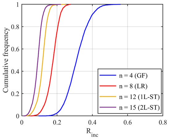 Since Rinc is estimated by the angle difference between normal vectors of the target sub-surface and the corresponding preceding sub-surface, it can be utilized to depict the IMV of a given particle at each RLS and, hence, can act as a morphological gene for the given particle. Different parts of this gene represent morphology variation at different RLS. Table 2 illustrates the variation of Rinc with SH decomposition for a sphere, a cube, and two LBS particles. For a sphere, Rinc is equal to 0 at all RLS because no IMV occurs across different RLS. Unlike the sphere, Rinc values for the cube and two particles show IMV at all RLS. Since Rinc at SH frequency n = 4 shows the morphology variation from a sphere to sub-surface of n = 4, it can be utilized to reflect the IMV of GF. From Table 2, Particle 0036 is more visually irregular than Particle 0006, and it shows a larger Rinc at n = 4 which means a larger IMV needed from a sphere to the target GF. Therefore, Rinc at n = 4 can reflect the irregularity of GF for a given particle. Specifically, the cube has large corners which produce large angle differences and, hence, the cube has an overall larger Rinc than these two LBS particles. Moreover, Rinc at n = 8, n = 12, and n = 15 depict the IMV of LR, 1L-ST, and 2L-ST, respectively. Figure 6 illustrates the cumulative distribution of Rinc at different RLS for all the 4155 LBS particles. By using Rinc, each part on the morphological gene corresponds to different target RLS with a uniform format of definition (Equation (8)). From the figure, the IMV at different RLS decreases with the increasing SH frequency, meaning that the IMV at small RLS is lower than that at large RLS, while the overall surface is still getting rougher with decreasing RLS. Due to the limitation of CT resolution, the discussion of Rinc is limited to n = 15, i.e., the 2L-ST. However, the Rinc proposed can be utilized to represent IMV at any smaller RLS, as long as particle data provided can meet that resolution.