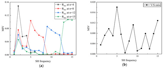 Figure 7 shows the MIV results of Rinc and V/S ratio. Solid lines in Figure 7a illustrate the Rinc at different RLS from GF (n = 4) to 2L-ST (n = 15). The abscissa denotes the SH frequencies which correspond to different RLS, while the ordinate depicts the MIV that can show the significance of each SH frequency in the estimation of Rinc. As can be seen from the figure, Rinc at different RLS shows a generally higher level of sensitivity to the corresponding RLS without inter-scale effects from other RLS. For example, Rinc at n = 4, based on the angle difference between normal vectors of sub-surfaces at n = 0 and n = 4, is highly sensitive to the SH frequency range from n = 2 to n = 4 and, thus, dominates the GF of the given particle. Similarly, Rinc at n = 8 dominates the LR; Rinc at n = 12 and n = 15 dominate the 1L-ST and 2L-ST, respectively. Furthermore, it is found that the estimation of Rinc will be slightly affected by GF, and this influence becomes lower for the reconstructed particle surface with a higher n value. Since, for a given sand particle, the GF is the same for all reconstructed particles with varying n values, the GF-related effects can be ignored. The MIVs of V/S ratio in Figure 7b, on the other hand, show an overall low sensitivity without any dominant RLS, which means that morphology information on all RLS can contribute to the evaluation of V/S ratio with similar weights. Therefore, by reflecting the incremental morphology variation at the target RLS without inter-scale effects from other RLS, the Rinc proposed is very suitable for acting as a morphological gene to represent the multi-scale feature of particle morphology.