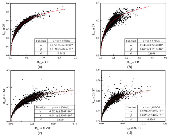 where α and β are scale-related parameters, and their values for different RLS are listed in the table of the corresponding figure. The correlation indices r2 for all RLS are larger than 0.83, which reflects the feasibility of Equation (12).