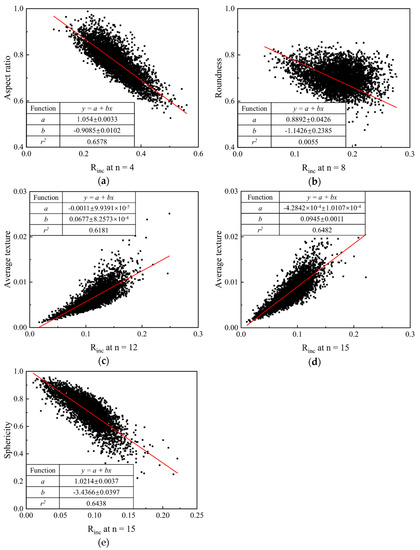 To help better understand the descriptor Rinc proposed in this paper, we correlate Rinc with traditional descriptors at different target RLS, as shown in Figure 9. As can be seen from the figure, Rinc shows a negative correlation with aspect ratio and sphericity while a positive one with average texture at the corresponding RLS. Specifically, Rinc at n = 4, as discussed above, reflects the IMV of GF, and a larger Rinc at n = 4 leads to a smaller aspect ratio. The intercept on the ordinate axis is around 1 which means that Rinc at n = 4 equal to 0 depicts a sphere. In addition, sphericity shows a similar variation trend with aspect ratio. This intercept on the ordinate axis is also around 1 which depicts that, for a sphere, Rinc = 0 at all RLS. Average textures of both 1L-ST and 2L-ST, on the other hand, illustrate an opposite variation trend, i.e., increasing with increasing Rinc at the corresponding RLS. Furthermore, from Figure 9b, roundness is poorly correlated to Rinc at n = 8. This is because the estimation of roundness is based on the curvature radius of all corners, as well as the maximum inscribed circle [20,53,54] and, hence, roundness focuses on the convex part for a given particle. Unlike roundness, Rinc at n = 8 reflects the IMV from GF to LR, and it contains morphology variation of both convex and concave parts for a given particle.