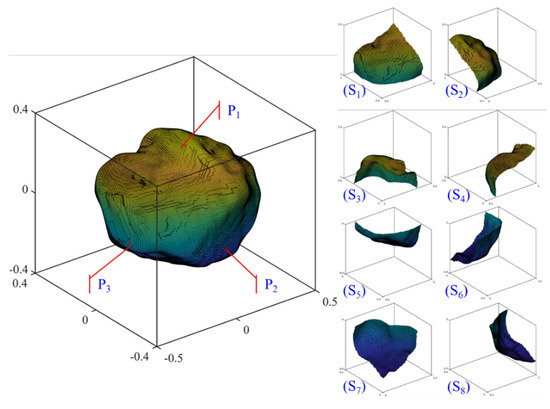 Three local points P1, P2, and P3 are selected randomly from a given particle surface, and eight parts of the surface are obtained by dividing the given particle with the three Cartesian coordination planes across the particle center (i.e., the XOY, YOZ, and XOZ planes), as shown in Figure 10, are used to illustrate the surface roughness heterogeneity. Table 4 lists the surface roughness heterogeneity quantified by different Rinc values at different RLS. For the whole particle, the Rinc values are 0.2003 for GF, 0.1303 for LR, and 0.1051 and 0.0658 for 1L-ST and 2L-ST. However, the three local points show different Rinc values at all RLS, reflecting the roughness heterogeneity of particle morphology. A similar phenomenon can be seen from the Rinc of all the local surfaces at different RLS. Specifically, the local surface S1 shows a higher Rinc than S2 for the GF, LR, and 2L-ST, but a lower value for the 1L-ST. This observation implies that the Rinc at different RLS are independent of each other, meaning that a given surface may be smooth at one RLS but rough at other RLS.