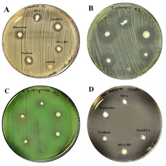 Zone of inhibition of five calcium silicate-based cements at 24 h against (A) S. aureus, (B) C. albicans, (C) P. aeruginosa, (D) No bacteria/control.